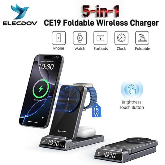 A 5-in-1 magnetic charging station for phones, watches, and earbuds—featuring 15W fast charging, a foldable design, cooling vents, and a bedside clock.